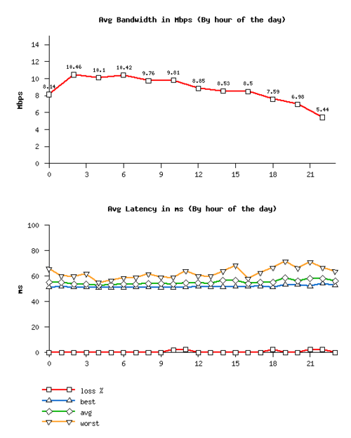 This graph shows the average bandwidth and latency (to my hosted server) for a given hour of the day over the last two weeks. That entire red line in the top graph has been sliding downwards lately. My comparisons page will also have a non-averaged graph of the last two weeks of data, which shows not only a downward trend, but a number of canyons where my throughput drops to around 2mbps. I’m very curious to see how CenturyLink does in comparison…